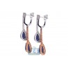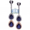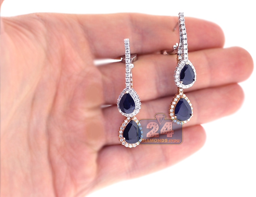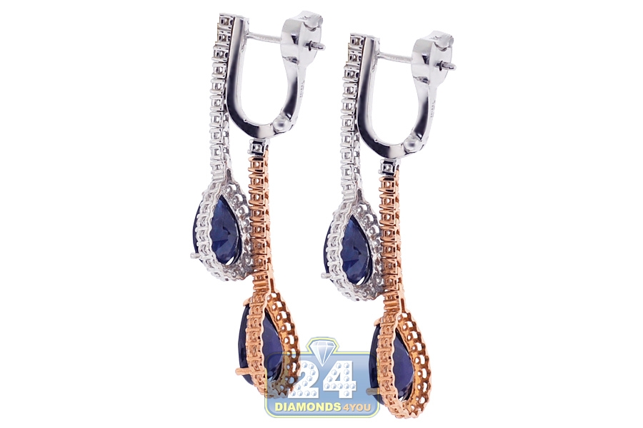 For an exotic touch, choose our magnificent pair of blue sapphire and diamond drop earrings! They are expertly produced from lustrous 18k gold of white and rose colors; and encrusted with pear-cut genuine blue sapphires, and icy white round brilliant-cut diamonds. This piece of jewelry is secured with a safe custom clasp. Get a look that's red carpet ready!