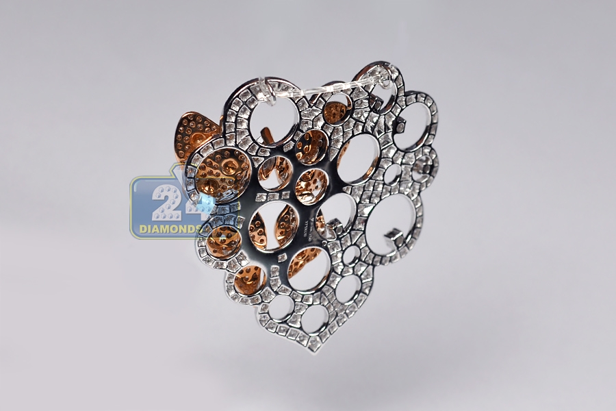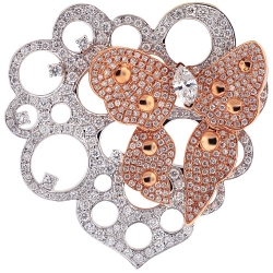 Wearing out splendid diamond butterfly pendant, you will keep spring alive all year round! It's masterly produced from 18k gold of white and rose colors as well as highly polished to add shiny look. The piece is set with 3.39 carats of icy white marquise- and round brilliant-cut genuine diamonds. It measures 43 mm in length and 43 mm in width. Two loops are designed for a chain of maximum 1.5 mm in thickness (or any necklace can be attached to this pendant by a professional jeweler). Prepare to sparkle with this women's filigree pendant!
