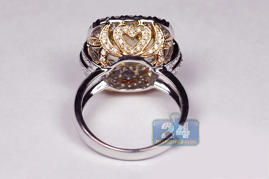 This gorgeous quartz diamond ring is a treasure for a jewelry lover's collection! It is masterly handmade of lustrous 18k gold of white and rose colors; and encrusted with genuine cushion-cut yellow quartz in the center (4.60 ct) and icy white round brilliant-cut diamonds on the sides (1.08 ct). A sumptuous display of luxury, quality and beauty that you will enjoy forever!