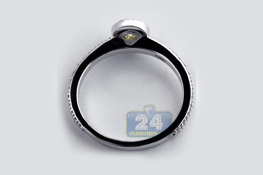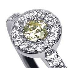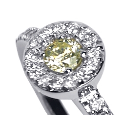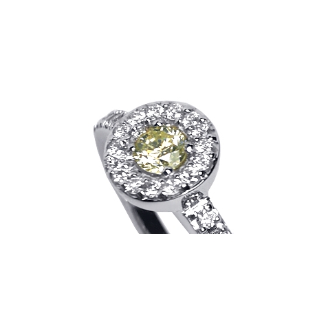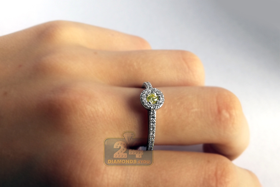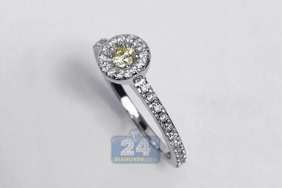 Experience brilliance and glamorous style of our fancy diamond halo ring! It's ably manufactured from cool 18 karat white gold, and highly polished for ultra smooth feel. This women's halo ring features natural fancy faint yellow round-cut diamond in the center (0.13 carat) and icy white diamonds around (0.27 carat). The top measures 6.5 mm in width, and the shank is 1.5 mm. A fabulous addition to any look!