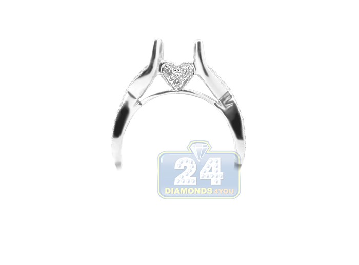 This unique design is just her style! Alluring shank splits into two glittering rows which flow into the lustrous crown. Beautifully gleaming 18k white gold setting holds a feminine heart pattern on both sides, under the square or round shaped center stone of your choice. All brilliants are totaling 0.60 carat and feature F-G color with VS1-VS2 clarity.