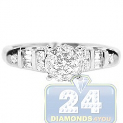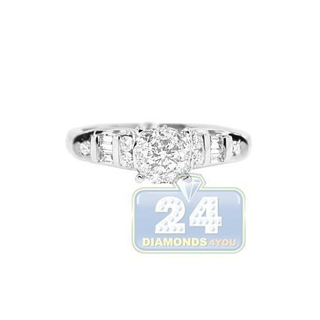 The continuous shine of this tremendous and sparkly diamond engagement ring captures the entire attention with its dazzling glitter! Absolutely gorgeous design features icy white round center diamond handset in a delicate crown adorned with a vintage inspired pattern. Fancy baguette cut diamonds decorate the unique styled shanks. Show your commitment with such a special engagement piece!