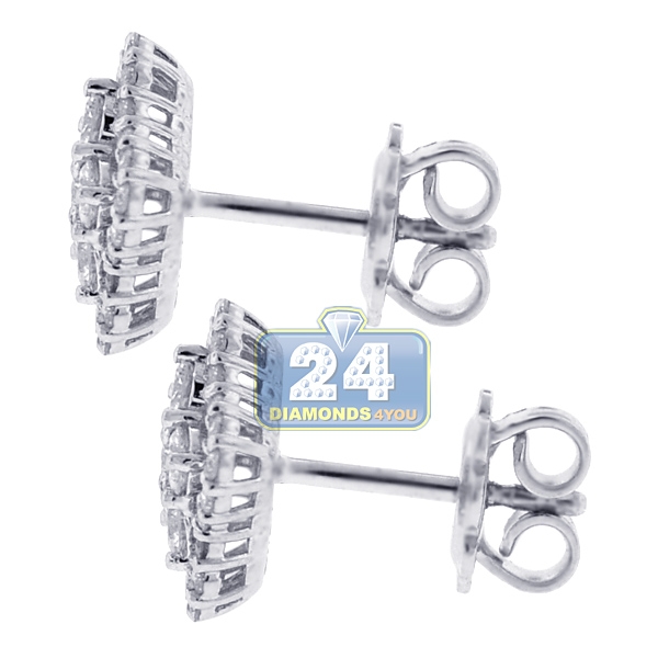 Chic and sparkling, our pair of stud earrings is showcase of style! They are professionally made of cool 18k white gold, and encrusted with 0.91 carat of icy white round-cut genuine diamonds. The pair of women's diamond studs measures 11 mm in width, and secured by user-friendly butterfly backs. These women's studs will highlight the look with brilliance!