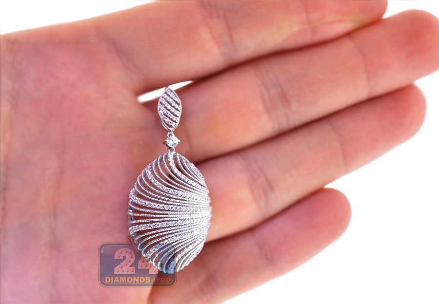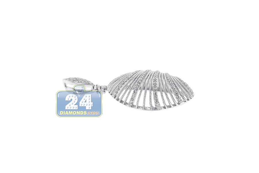 Modern design of a leaf shape, this diamond openwork pendant has stunning look! It's artfully produced from luxurious 18k white gold. and has highly polished rhodium finish. The drop pedant is accented with 0.76 carat of gleaming white round brilliant-cut genuine diamonds. Our women's diamond pendant features 42 mm in dangling length and 19 mm in width. Dress up your favorite outfit with the diamond leaf pendant!