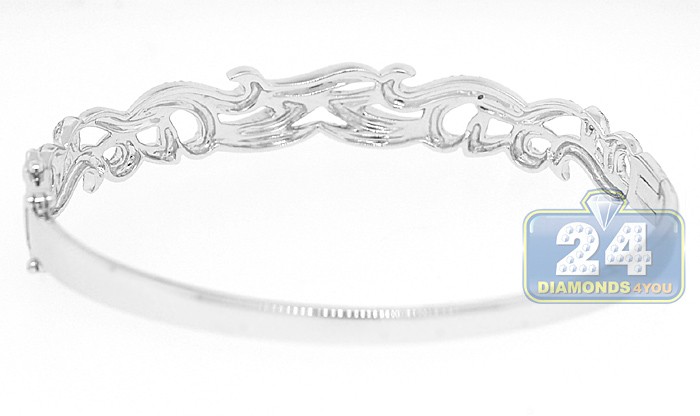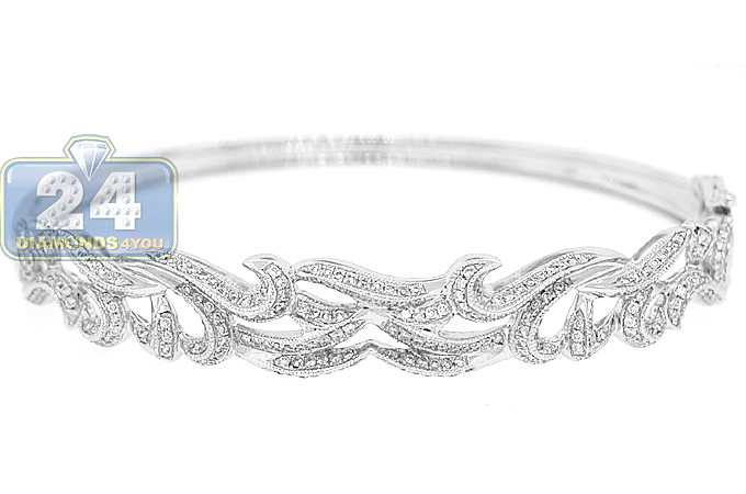 Alluring and unique, this diamond bangle bracelet carries a incomparable flow of sparkle! It's professionally created from luxurious 18 karat white gold, and has highly polished rhodium-covered finish. Our women's round bangle is amazed with 1.00 carat of icy white round-shaped genuine diamonds. It also measures 7.5 inches in length and 10 mm in width. Amazing vintage look!