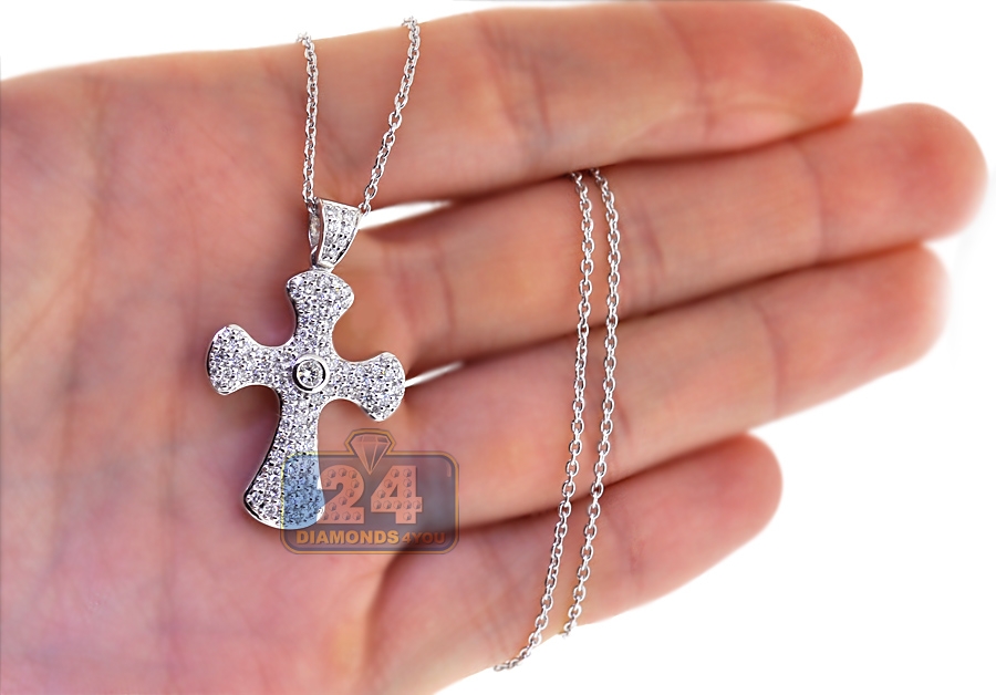 Celebrate your faith with this timeless diamond cross pendant! Professionally handmade of luxurious 18 karat white gold, it has highly polished shiny finish. Our byzantine shape cross is encrusted with icy white round brilliant-cut genuine diamonds totaling 1.15 carat (SI1-SI2 clarity, G-H color). Our men's cross pendant measures 36 x 22 mm, and comes with the chain of 18 inches (can be changed). Modern expression of your religious belief!