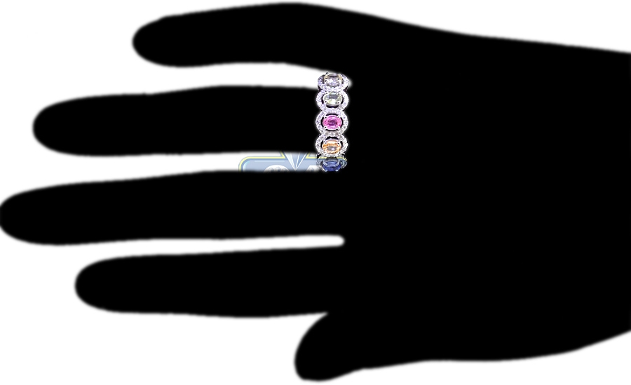 Our multicolored sapphire ring always shines with fun rainbow colors! You will never be bored with such an exquisite piece on your finger! It is expertly handmade of cool 18k white gold, has perfectly polished finish, and professionally encrusted with icy white round brilliant-cut diamonds (0.36 ct), and oval-cut gemstones of different colors (1.10 ct). There is no doubt, this jewel is going to be a very special one in your jewelry collection!