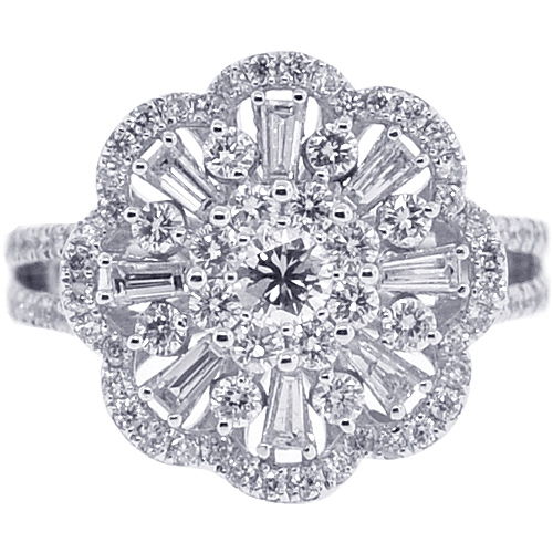 Uniquely designed for sophisticated ladies, our diamond flower ring flashes with the impression! Ably handcrafted in lustrous 18k white gold, it is studded with 1.50 carat of icy white baguette-, round brilliant-cut genuine diamonds. You will not be able to take the eyes off of this breathtaking cluster ring!