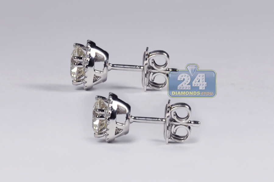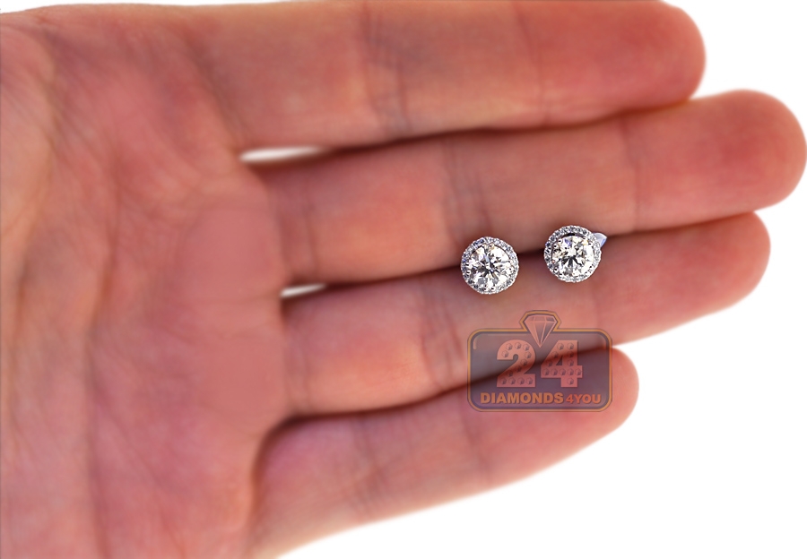 Liven your fancy evening look up with these diamond halo stud earrings! Artfully crafted in cool 18k white gold, they have high-polished shimmering finish. Our stud earrings for women have two central icy white round brilliant-cut natural diamonds (1.43 carat) that haloed by identical small diamonds (0.30 carat). The top measures 7.5 mm in width; and secured by user friendly push backs. Day or night, this pair of diamond stud earrings make a sparkling statement!