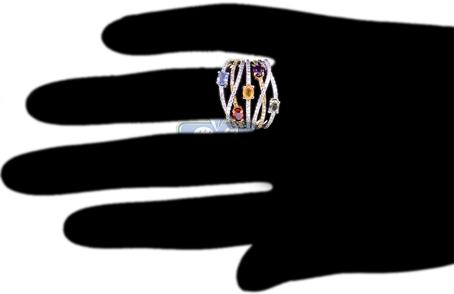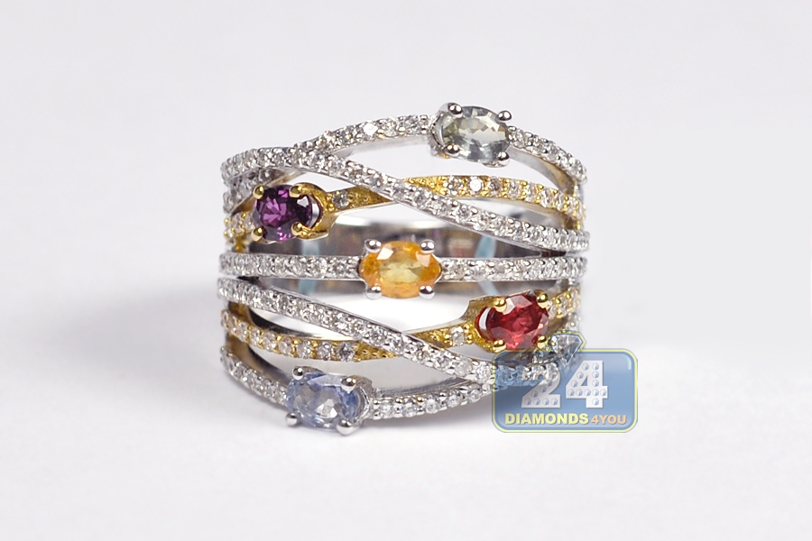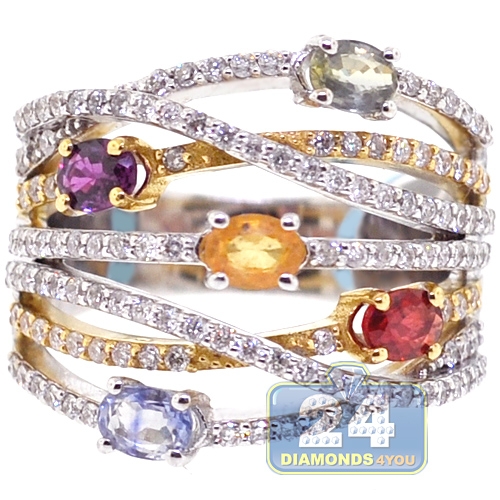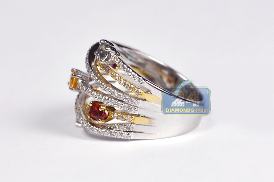 Featuring absolutely natural materials, fancy design and top notch craftsmanship! This gemstone band is one of its kind! The ring is expertly handmade of mixed cool and warm 18k white and yellow gold, has high polished finish, and encrusted with icy white round brilliant-cut diamonds (0.80 ct), and oval-cut gemstones of different colors (1.16 ct). There is no doubt, this ladies gemstone highway band is a real treasure!