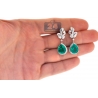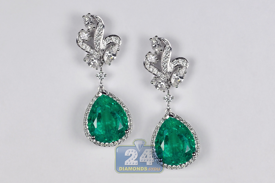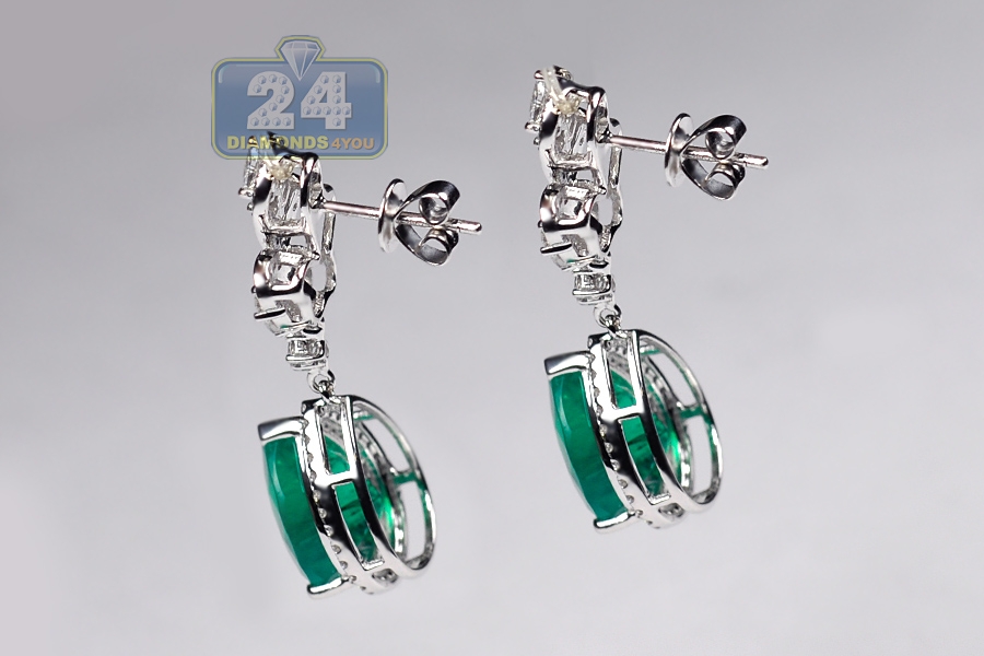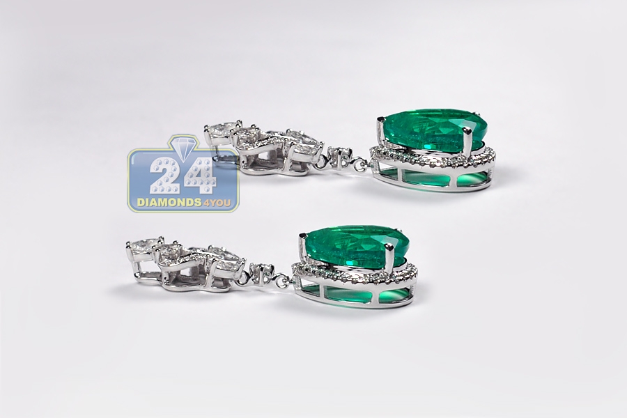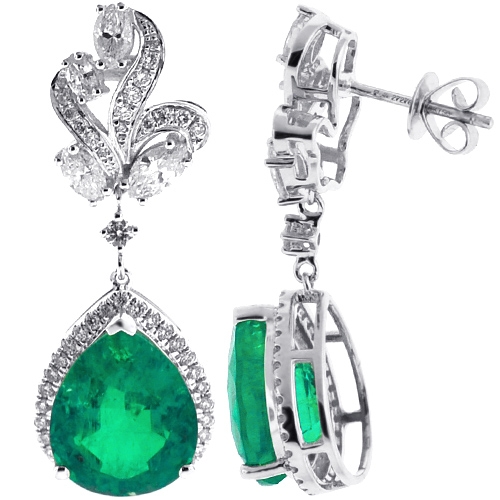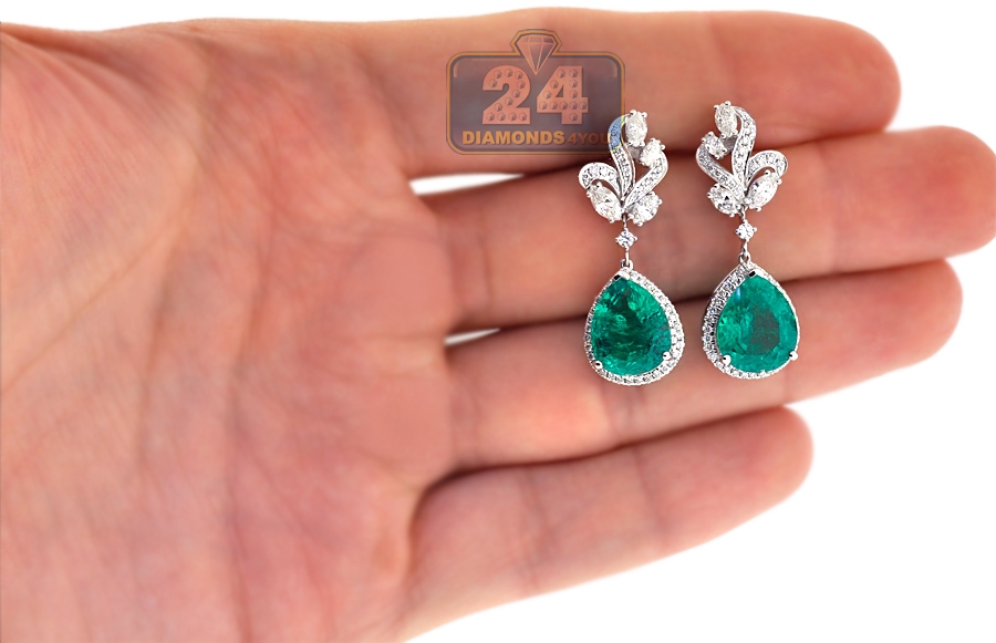 Stylish fusion of contemporary and traditional designs comes in these gemstone drop earrings! Professionally made of luxurious 18k white gold, they feature ultra-shimmering look. The pair of women's earrings is encrusted with two real-looking flux-grown green emeralds of pear-shape, both weighting 8.55 carats. They're surrounded by white marquise- and round-cut genuine diamonds totaling 1.64 carat (VS1-VS2, F-G). The dangling earrings have height of 35 mm, width of 12.5 mm; and closed by secure push backs. These are red carpet-worthy diamond drop earrings for women!