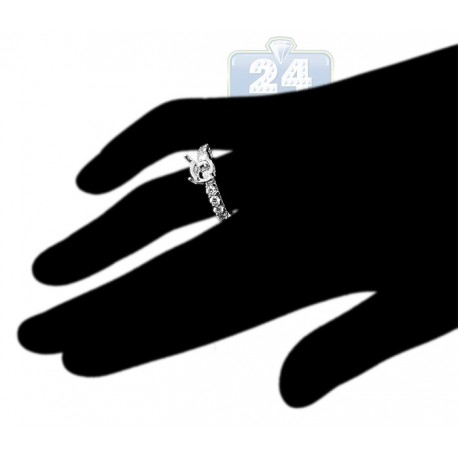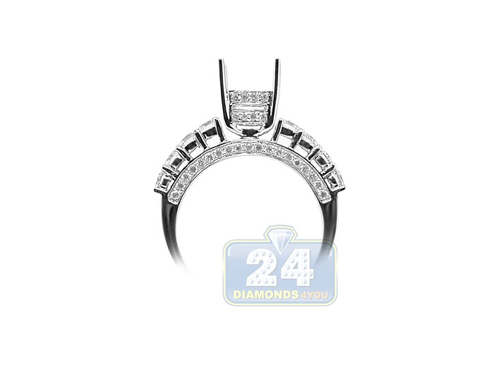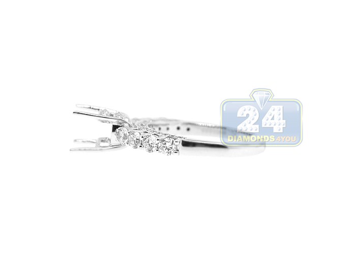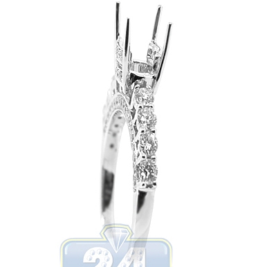 Luxurious & fancy! Show your love and commitment with this vintage inspired 18k white gold engagement setting! The shank of our gorgeous semi mount features icy white and eye clean round cut diamonds. The upper part is skillfully handset with four large dazzling diamonds on each side of the center stone. The striking crown can fit a round shape diamond of your choice. All precious diamonds have 1.05 carat total weight.