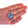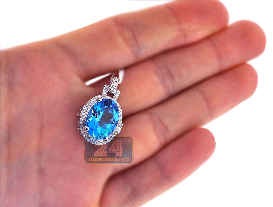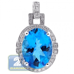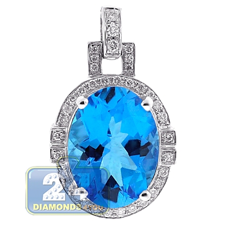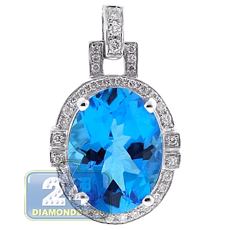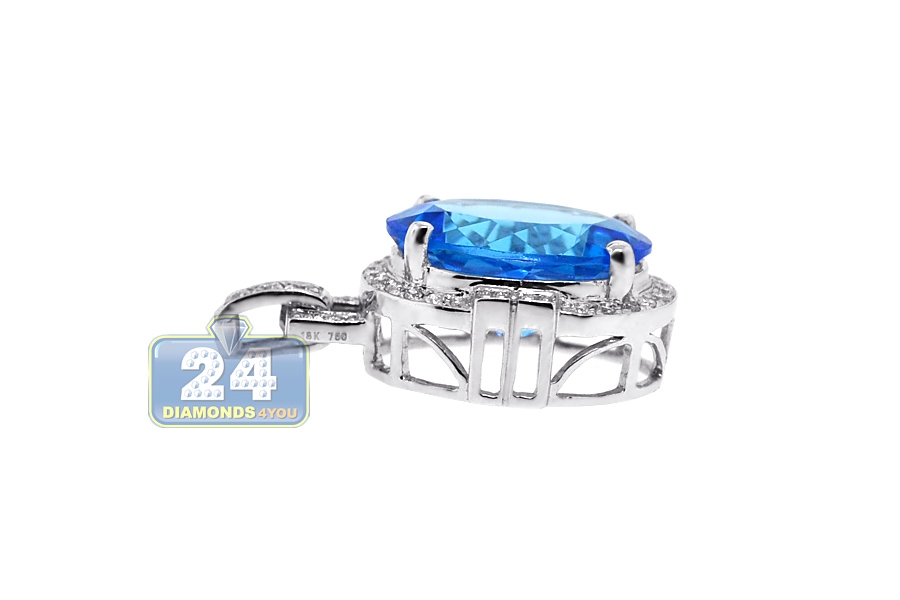 You will feel like a beautiful princess wearing this diamond blue topaz drop pendant! Ably produced from luxurious 18k white gold, it has highly polished rhodium-covered finish. The drop pendant is set with huge oval-cut genuine blue topaz in the center that haloed by lustrous white round brilliant-cut diamonds. Our women's gemstone pendant measures 26 mm in height and 16 mm in width. A lovely addition to your jewelry collection!