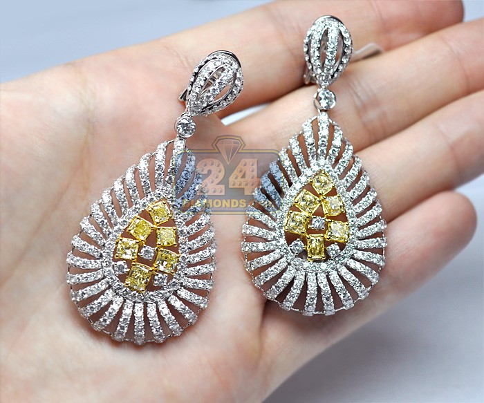 Shinning with icy white and fancy yellow diamonds, these dangle earrings are created for a real queen! Top quality genuine materials and exceptional craftsmanship make this pair absolutely priceless! The settings are masterly handmade of high polished 18k white gold and professionally handset with multishaped diamonds totaling 13.66 carat. Each stone is handpicked and has high grades of color and clarity.