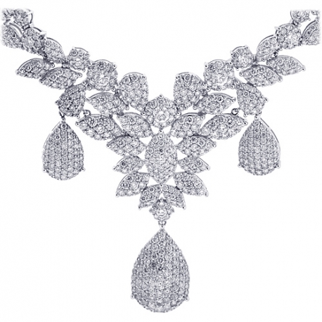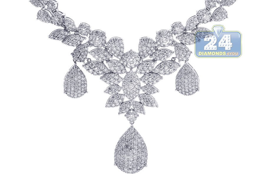 Prepare to be admired if you choose our women's diamond necklace for your next special event! Professionally created from luxurious 18 karat white gold, it's precisely polished for very shimmering finish. The flower drop necklace is studded with 15.53 carats of gleaming white round brilliant-cut natural diamonds (SI1-SI2 clarity, G-H color). The piece measures 18 inches in length with the dangling part of 2 1/5 inches. It's also secured with the safest and user-friendly box clasp. This diamond necklace sparkles from beginning to end of the floral design!