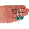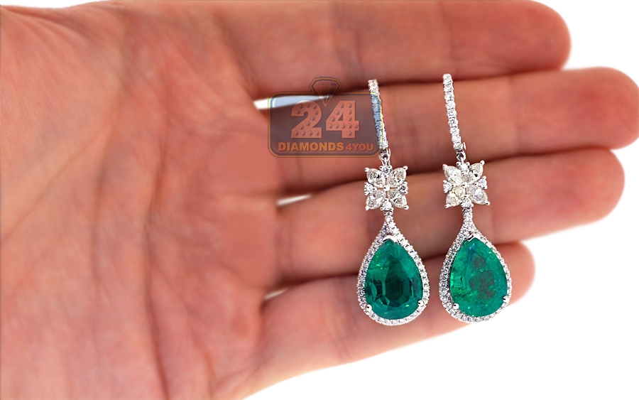 Upscale and modern, our pair of women's dangle earrings will show off your sophisticated taste of luxury! It's artfully crafted in cool 18k white gold, and polished for very smooth shiny finish. These gemstone earrings are amazed with two tremendous flux-grown pear-cut emeralds of 13.70 carats. They're illuminated by 2.55 carats of white marquise- and round brilliant-cut natural diamonds. Hanging length of the piece is 47 mm, and the widest part is 14 mm. Do you want to get all eyes on you? Choose these real-looking emerald earrings for women!
