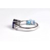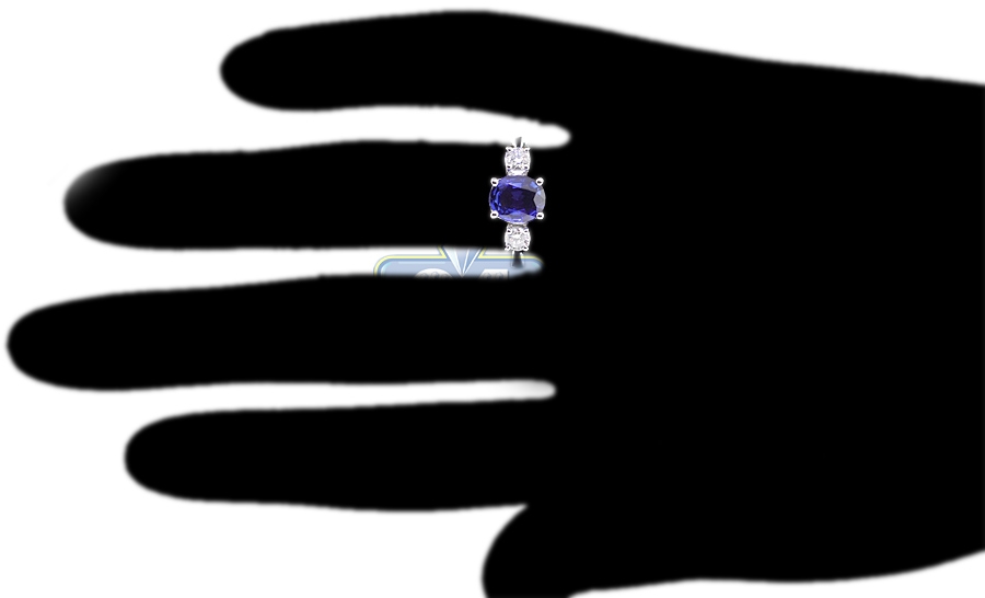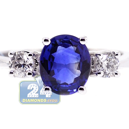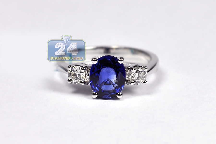 You are looking at a classic three stone ring with natural diamond and royal blue sapphire! Simple and extremely elegant, the piece is professionally handmade of cool 18k white gold with highly polished finish, and expertly encrusted with icy white round brilliant-cut diamonds (0.34 ct) and blue oval-cut sapphire (1.75 ct). This women's gemstone ring is great for an engagement and can be worn with any outfit!