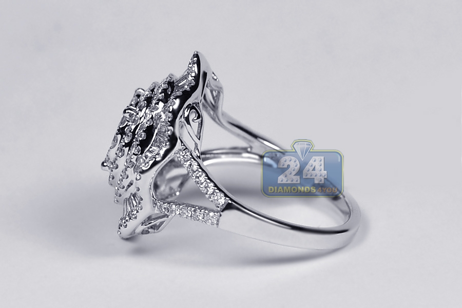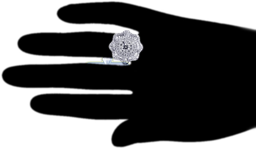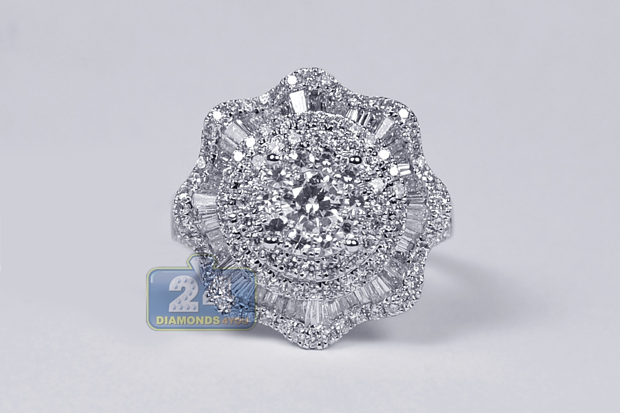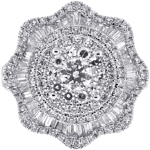 Here is a fabulously sparkling diamond cluster ring! Professionally handmade of lustrous 18k white gold, it is shimmering with icy white baguette- and round brilliant-cut genuine diamond totaling 2.23 carats. If you choose this lady's spectacular flower ring, you are sure to make a lasting impression!