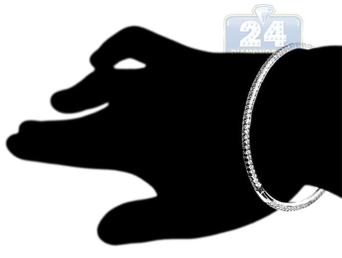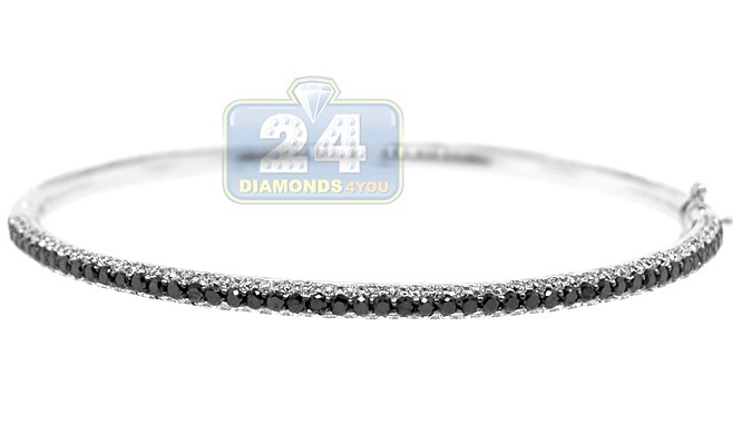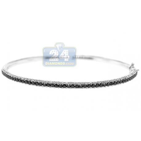 Show off your everlasting love to jewelry with this remarkable diamond bangle bracelet! Masterly created from chic 18 karat white gold, it has highly polished rhodium finish. Our women's oval bangle is studded with exceptional combination of icy white and magic black natural diamonds, all weighting 2.55 carats. It measures 7 inches in inner length and 3 mm in width. Gorgeous stand-out piece!
