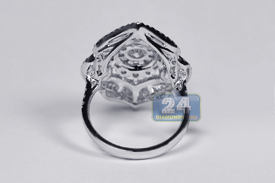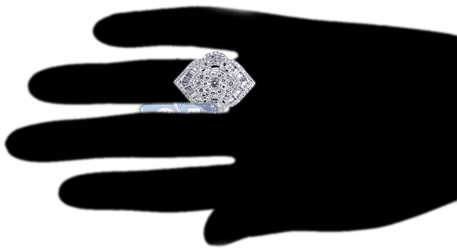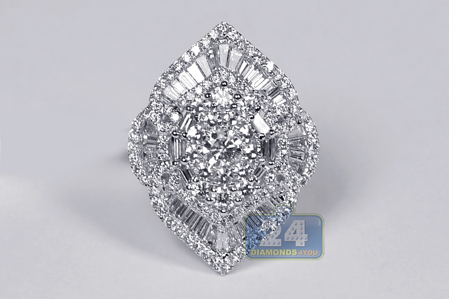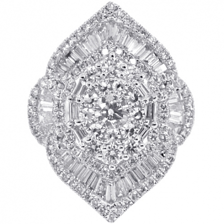 Designed for maximum dazzle and sizzle, our splendid diamond cluster ring is an exquisite find! Professionally handmade of cool 18k white gold, this piece of jewelry is studded with 2.72 carats of icy white round brilliant- and baguette-cut genuine diamonds. Lose yourself in the magical sparkle of this lady's diamond ring!