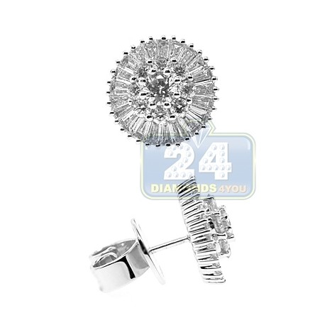 Our flower stud earrings glisten with precious round & baguette cut natural diamonds of 2.00 carats (VS2-SI1, G-H). They're professionally made of luxurious 18k white gold with high-polished shiny finish. These women's diamond studs measure 12 mm in width. The floral earrings have a strong secure push-backs and very elegant luxurious look!