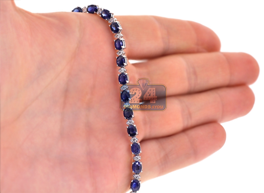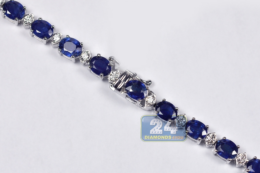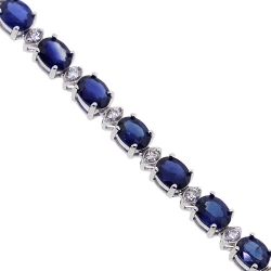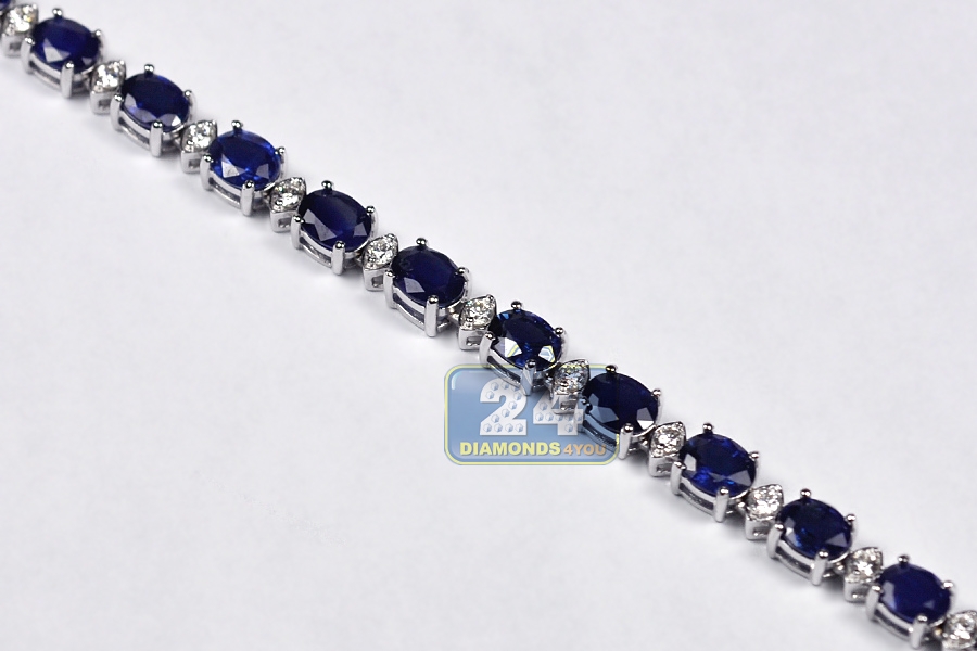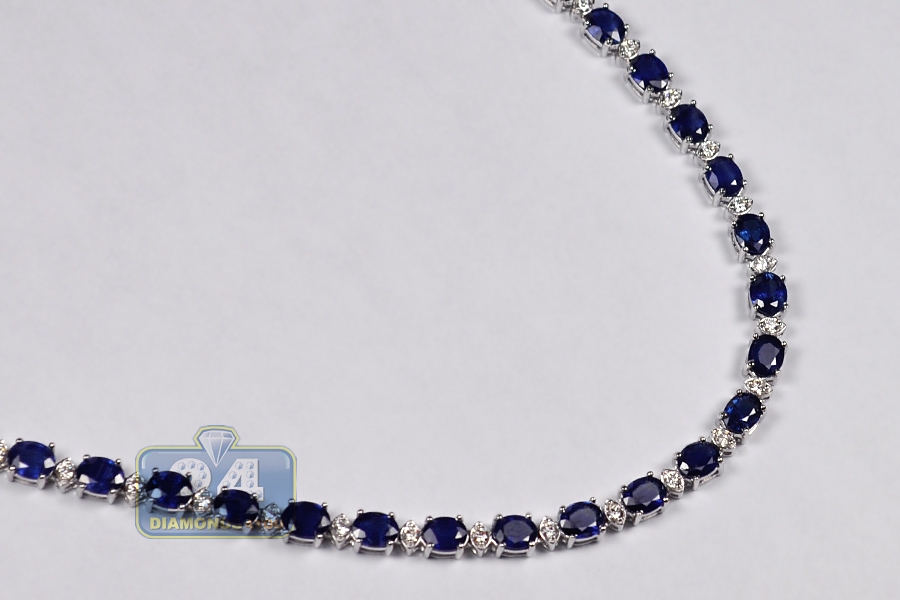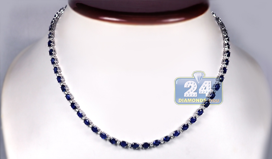 Our unique sapphire diamond tennis necklace will glamorize any outfit! It's masterly produced from luxurious 18k white gold, and has rhodium-covered polished finish. The gemstone tennis necklace is studded with 23.68 carats of oval-cut genuine blue sapphires, and 1.50 carat of icy white round brilliant-cut diamonds. Our women's gemstone necklace measures 16.5 inches in length, 4 mm in width, and closed by a safe box clasp. Adorn your neckline with a luxurious look!