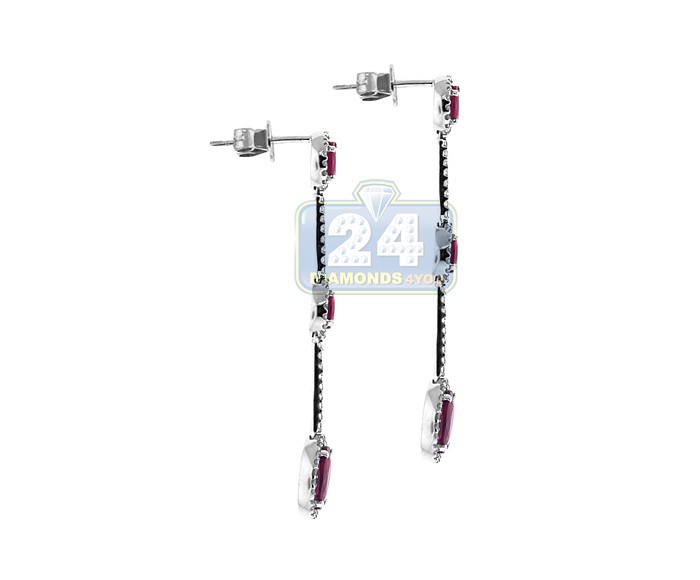 Add a little elegance to your life with a pair of ruby and diamond earrings crafted in 18k white gold. This amazing jewelry piece features rich oval ruby gems (2.65 ct) placed on a sparkling diamond chain (0.46 ct). A combination of glitter and color are formed together just for you. Our women's drop earrings have hanging length of 42 mm and width of 7 mm. Secure push-back closure and a perfect look for any dressy occasion!