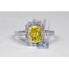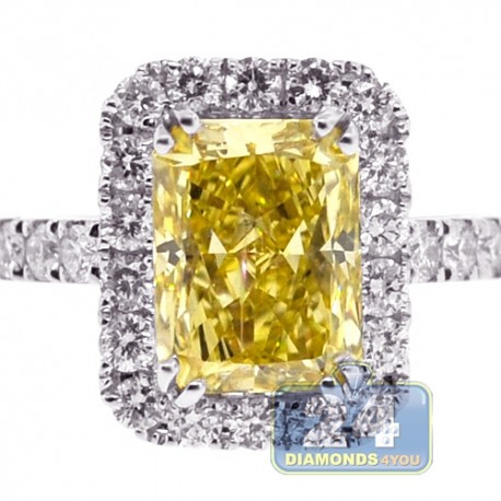 Get engaged with fancy luster and chic! Our special yellow diamond engagement ring is the right choice if you are a fan of colored stones! It is professionally handcrafted from lustrous 18k white gold polished to perfection, and expertly encrusted with yellow emerald cut diamond totaling 2.50 carat. The center stone is gorgeously surrounded with genuine round cut diamonds with the total weight of 0.80 carat. Each of these stones is VS2 clarity and F-G color which means absolute eye cleanliness and amazing sparkle. Our elegant engagement ring is gorgeous beginning of your never ending love!
