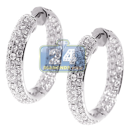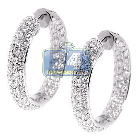 These luxurious round hoop earrings will light up your evening with unforgettable glamour and style! They're artfully created from lustrous 18k white gold with highly polished shiny finish. Our women's hoop earrings are encrusted with 3.53 carats of icy white round brilliant-cut natural diamonds (VS1-VS2 clarity, F-G color). They have height of 25 mm and width of 5 mm. These inside-out diamond hoops are ready for the red carpet!