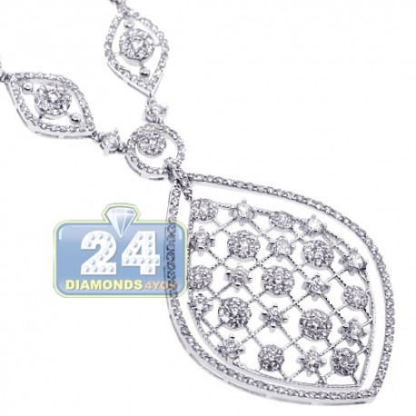 You will shine like a star whenever you wear our splendid diamond chandelier pendant necklace! Expertly handmade of luxurious 18k white gold, it features rhodium-covered precisely polished shiny finish. The pendant necklace is accented with 3.76 carats of gleaming white round brilliant-cut real diamonds (SI1-SI2 clarity, G-H color). This women's diamond necklace has 16.25 inches in length around the neck, 7.5 mm in width of links and 48 x 31 mm in size of the central part. It's also secured by a safe lobster claw clasp. This diamond pendant necklace is sure to command attention!