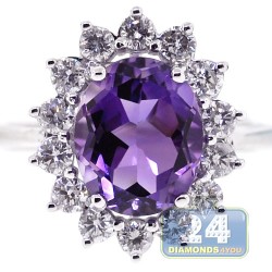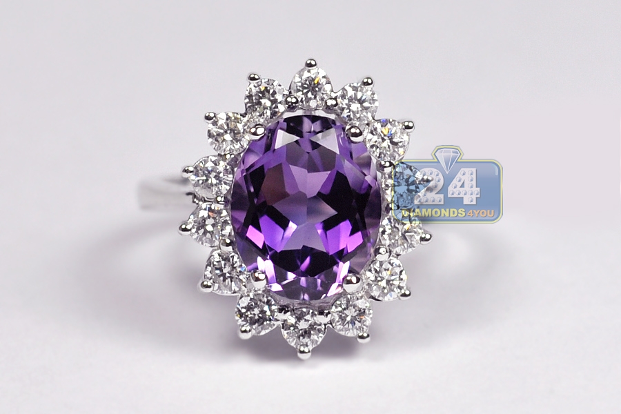 Beautiful and sophisticated, this stunning diamond gemstone ring will suit you perfectly! It is expertly handmade of lustrous 18k white gold with highly polished finish, and encrusted with icy white round brilliant-cut diamonds (0.85 ct) and natural purple oval-cut amethyst (3.46 ct). This women's gemstone ring is destined to become an integral part of your jewelry collection!