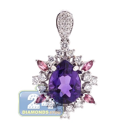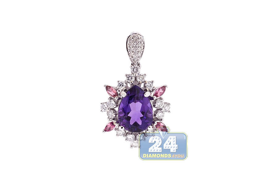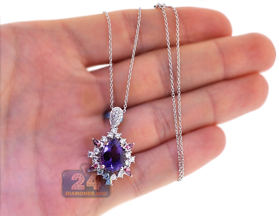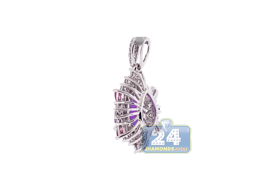 You will feel like a beautiful princess wearing this gemstone drop pendant! Ably produced from luxurious 18k white gold, it has precisely polished rhodium finish. The drop pendant is encrusted genuine pear-cut purple amethyst in the center that is surrounded by lustrous white round brilliant-cut diamonds (0.70 ct) and genuine marquise-cut pink sapphires. Our women's gemstone pendant measures 29 x 18 mm. A gorgeous addition to your jewelry collection!