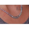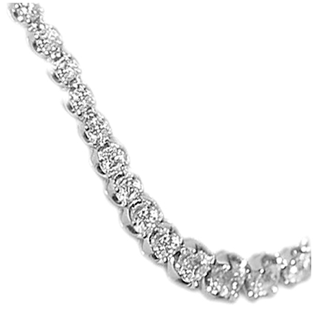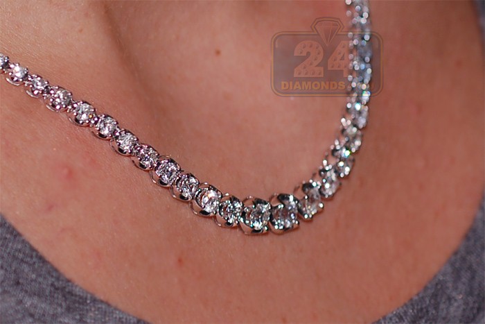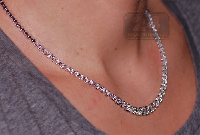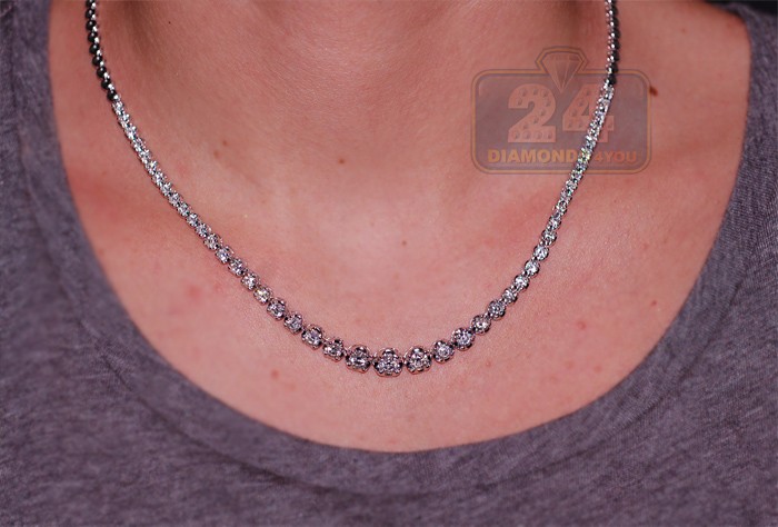 Every woman deserves a stunning piece of jewelry, and this dramatic diamond tennis necklace is an excellent choice! It's professionally crafted in luxurious 18k white gold with high-polished rhodium-covered finish. The graduated tennis necklace are 4-prong set with gleaming white round brilliant-cut natural diamonds, all weighting 4.40 carats. Our women's diamond necklace has length of 16 inches, and its width varies from 3 to 7 mm. Go for glamorous with the diamond halo tennis necklace!