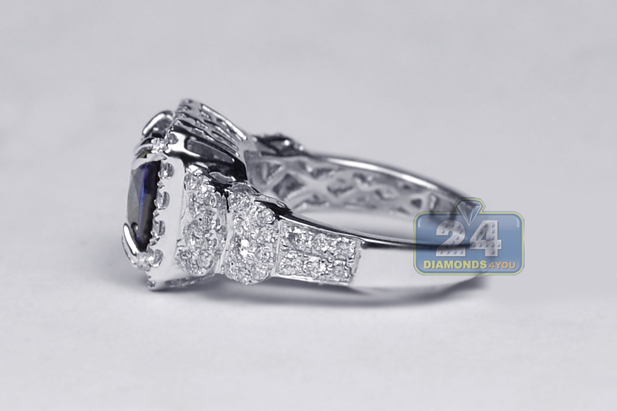 Our breathtaking gemstone with diamonds ring can be a lovely engagement or signature piece! It is artfully created from lustrous 18k white gold; encrusted with diffused blue cushion-cut natural sapphire in the center, and icy white round-cut diamonds on the sides. This women's sapphire ring combines wonderful fusion of elegance and shimmering!