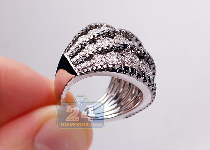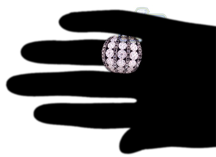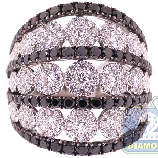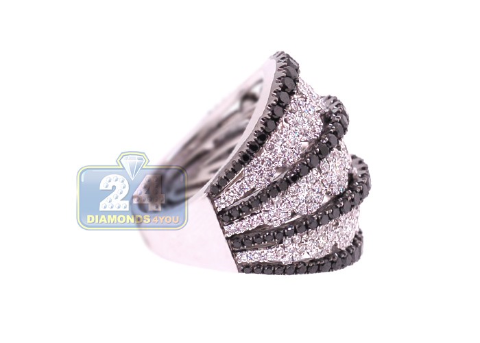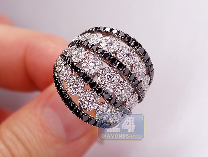 Our luxurious vintage inspired wide band is masterly designed specially for a sophisticated lady! The piece presents a durable setting handmade of pure 18k white gold with perfectly polished finish, and a magic combination of natural black with icy white diamonds totaling 4.07 carats, SI1-SI2 clarity and F-G color. What a truly spectacular diamond cluster ring for a princess!
