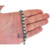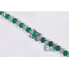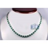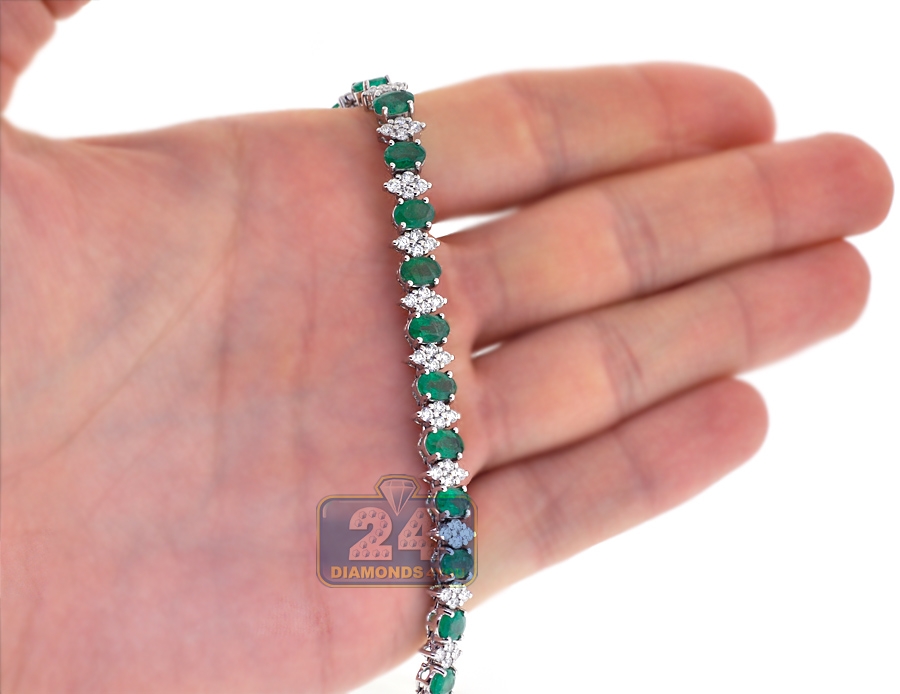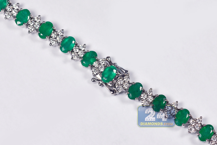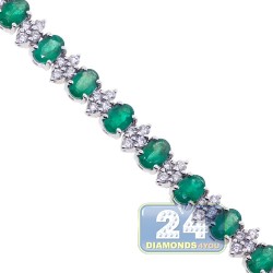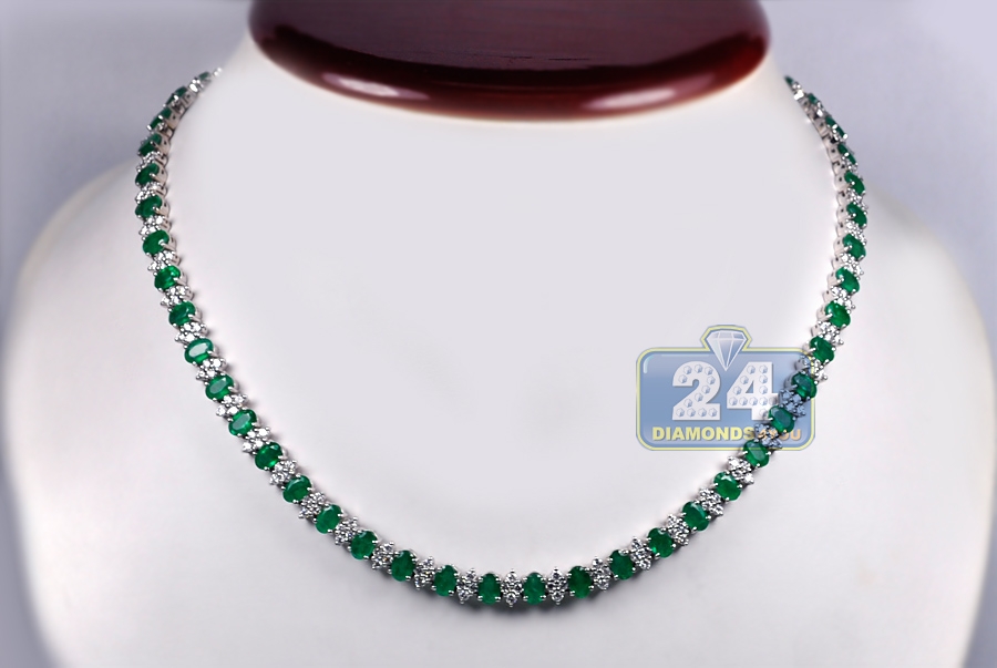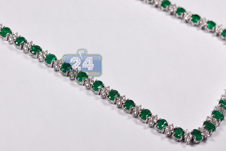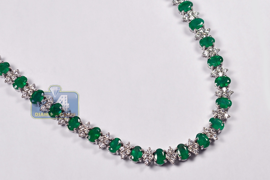 Have you ever dreamed of being a queen?! Your fantasy will come true with our majestic emerald diamond tennis necklace! Artfully handmade of cool 18k white gold; it has highly polished smooth finish that covered with bright white rhodium. The tennis necklace is encrusted with 34.50 carats of oval-cut genuine green emeralds, and 6.55 carats of sparkling white round brilliant-cut diamonds. Our women's gemstone necklace features length of 17 inches and width of 7 m.; secured by the safest box-with-two-latches clasp. Adorn your neckline with pure elegance!