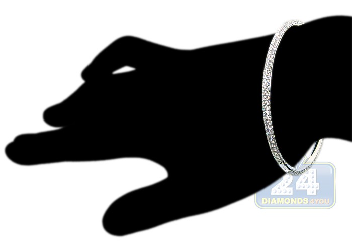 Our glamorous oval bangle bracelet shimmers with 4.19 carats of icy white round brilliant-cut natural diamonds (SI1-SI2 clarity, F-G color). The piece is artfully manufactured from luxurious 18 karat white gold covered with rhodium, and precisely polished for ultra smooth feel. It also measures 7 inches in length and 3 mm in width. Important note of high-fashion accessorizing!