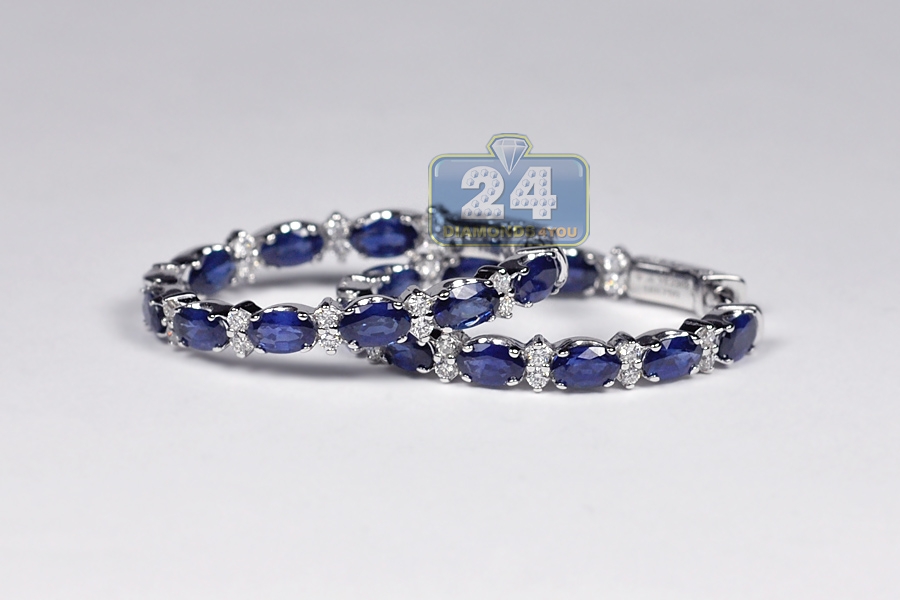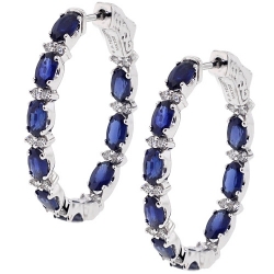 Our fascinating pair of diamond oval hoops will illuminate your ears in a unique way! Artfully made of cool 18k white gold, they have highly polished shimmering look. The piece of jewelry is encrusted, outside and inside, with genuine oval-cut blue sapphires of 4.68 carats that highlighted by 0.53 carat of icy white round brilliant-cut diamonds. They're closed with secure hinged snapbacks. The pair measures 30 mm in height and 3.5 mm in width. These women's gemstone hoop earrings can be an ideal choice for your next special event!