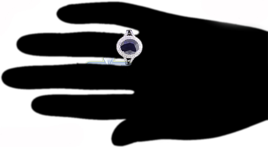 Exquisite in its beauty, our sapphire diamond ring is sure to be admired! It is masterly produce from lustrous 18k white gold; encrusted with oval-cut genuine sapphire (4.73 ct) in the center and icy white round brilliant-cut diamonds (0.90 ct) around. Lovely play of colors! This ring is a part of the set. Earrings and a pendant are also available.