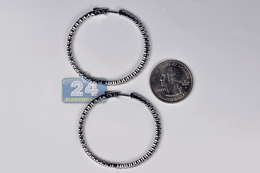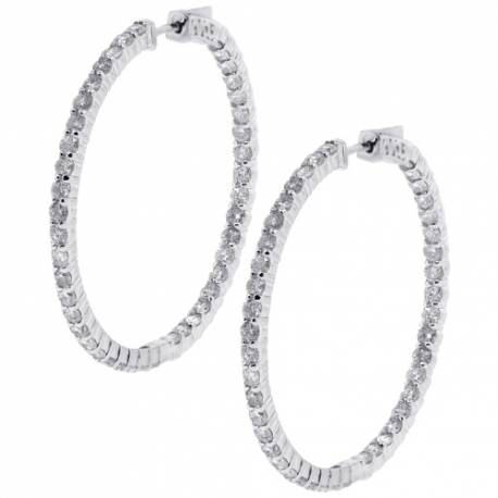 Don't be surprised when you sparkle non-stop in our lovely diamond hoop earrings! Artfully made of cool 18k white gold, they have high-polished shimmering finish. They're also encrusted with 5.75 carats of icy white round brilliant-cut natural diamonds. Each of the pieces measures 43 mm in hanging length and 2.5 mm in width; they're closed by comfortable secure hinged snapbacks. These women's round hoops captivate with elegant classic style!