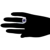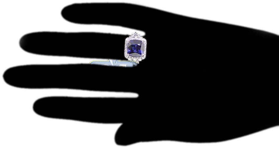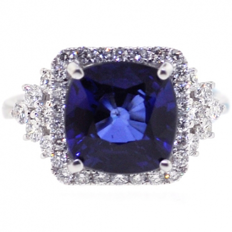 This diamond and blue sapphire ring will give your finger spectacular sparkle! Ably created from cool 18k white gold, it is encrusted with diffused blue cushion-cut natural sapphire (5.33 ct) in the center, and icy white round brilliant-cut genuine diamonds (0.75 ct) around. This diamond gemstone ring is perfect as engagement or another special occasion gift!