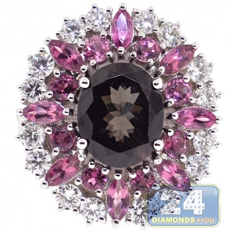 Nature inspired and created by human, our fancy diamond gemstone ring is perfect to wear for every occasion! The piece features lustrous 18k white gold with high polished finish, genuine round cut diamonds (1.31 ct), natural dark brown oval-cut tourmaline (3.45 ct) and pink round-, marquise-cut sapphires (1.63 ct). All brilliants are absolutely eye clean and sparkling with SI1-SI2 clarity and G-H color. Add such a beautiful item to your stylish everyday look!