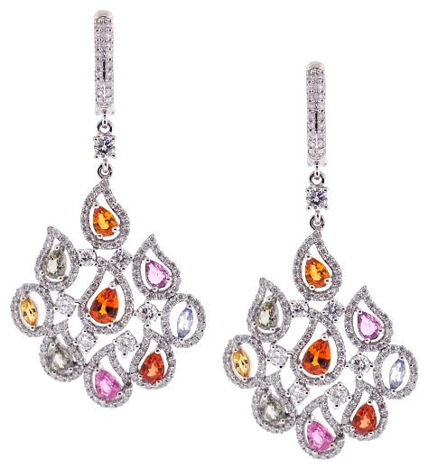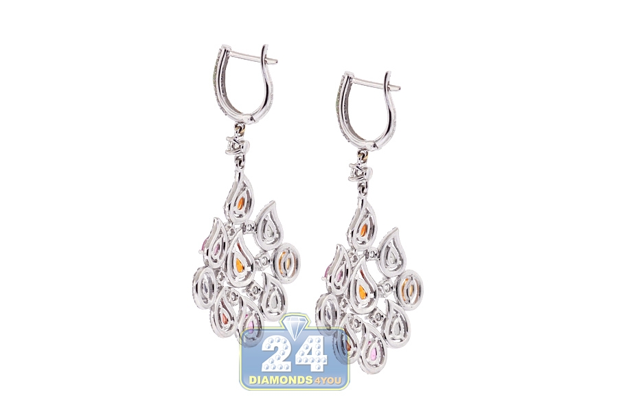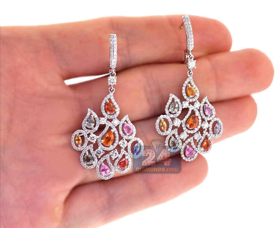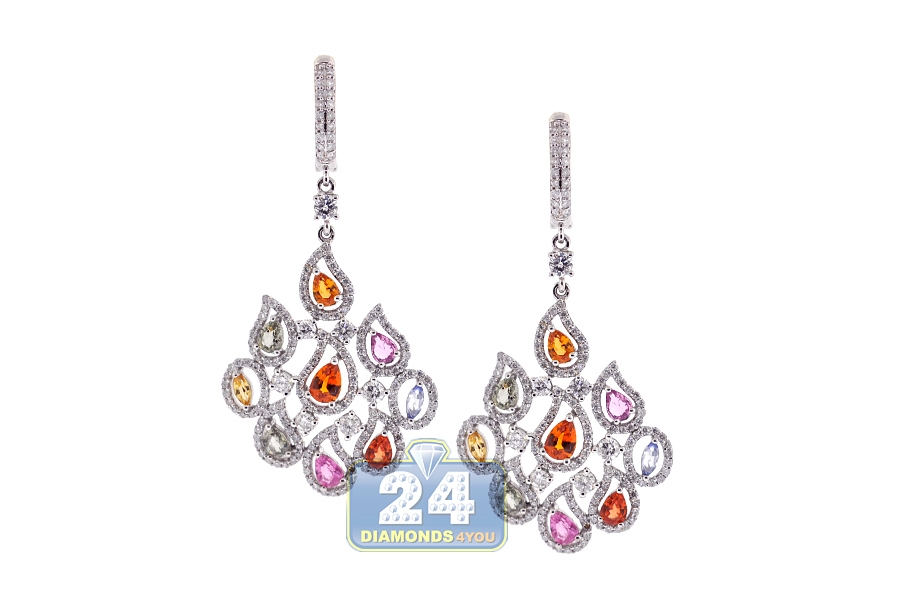 Featuring gorgeous design, this pair of diamond gemstone earrings are filled with star power and glorious illumination! They're artfully handmade of luxurious 18 karat white gold, and encrusted with natural multicolored sapphires of pear shape (4.01 carats) and icy white round brilliant-cut diamonds (2.42 carats). Our women's gemstone earrings measure 50 mm in hanging length and 25 mm in width. Bring elegant hint of color to your look with these gemstone dangle earrings!