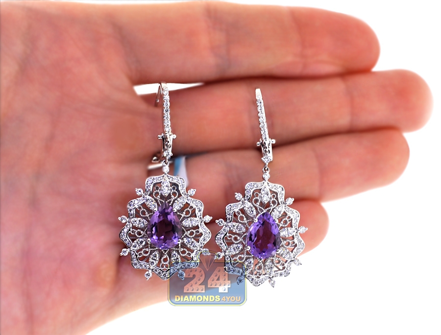 Featuring vintage design, this pair of diamond amethyst earrings are filled with star power and glorious illumination! They are handmade of lustrous 18k white gold, and encrusted with genuine purple pear-cut amethysts (5.06 ct) and icy white round brilliant-cut diamonds (1.74 ct). These women's drop earrings measure 48 mm in hanging length and 23 mm in width. Bring elegant hint of color to your look with these gemstone dangle earrings!