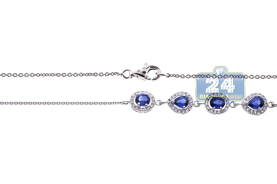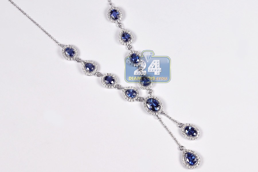 This blue sapphire lariat necklace is a modern take on the classic strand! It's skillfully handmade of luxurious 18k white gold, and has high-polished bright rhodium finish. Women's gemstone necklace is encrusted with 5.68 carats of oval and pear-cut natural blue sapphires that haloed by 0.84 carat of shiny white round brilliant-cut diamonds (SI1-SI2 clarity, G-H color). Our diamond drop necklace measures 18 inches in length around the neck and 7 mm in width of links. Endless everlasting elegance!