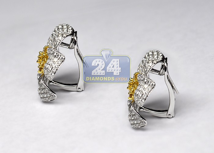 Unique and extraordinary in design, these fancy diamond earrings are ably handcrafted in lustrous 18k white gold, and features a beautiful flower design covered in shimmering diamonds showcasing plenty of natural fancy yellow and icy white diamonds, all totaling 6.61 carats (VS1-VS2 clarity, F-G color). They also measures 24 x 24 mm. A wonderful gift for someone special!
