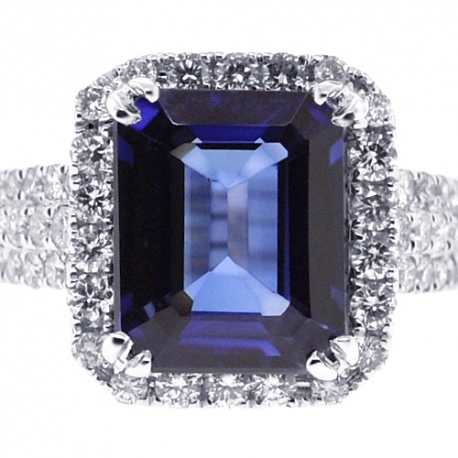 Our diamond gemstone ring will captivate you with its magical charm! Gorgeously created from 18k white gold, if has high-polished smooth and shiny finish. It's encrusted with emerald-shaped diffused blue natural sapphire of 6.23 carats that highlighted by icy white round brilliant-cut diamonds, all totaling 1.20 carat. The top measures 15 mm in width, and the shank is 4 mm. This lady's cocktail ring can be a stunning engagement ring or a signature piece for special occasions!
