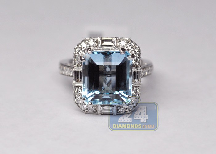 Beautify your finger with this gorgeous gemstone cocktail ring with a real vintage spirit! The ring is masterly crafted in pure 18k white gold with shiny polished finish, and skillfully accented with natural 6 carat blue topaz in the center and genuine icy white diamonds weighting 1.66 carat on the sides. These brilliants are perfectly eye clean and sparkling, round and baguette cut of G-H with SI1-SI2 clarity. This impressive piece is a must have for gemstone jewelry lovers!