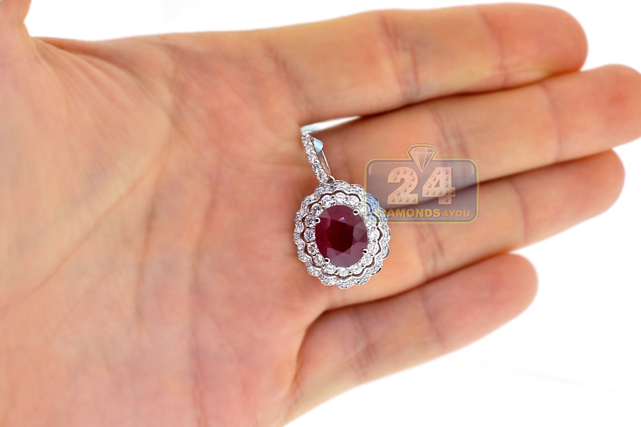 Here is a stunning gemstone drop pendant for ladies from our gemstone collection! It is beautifully made of lustrous 18k white gold; and features highly polished rhodium covered finish. The piece is encrusted with huge oval-cut natural ruby (treated) in the center (7.30 carats), and icy white round brilliant-cut genuine diamonds around (1.45 carat). Our women's gemstone pendant has dangling length of 30 mm and width of 19 mm. You will be delighted with sparkle of ruby and diamonds in this gorgeous floral pendant!