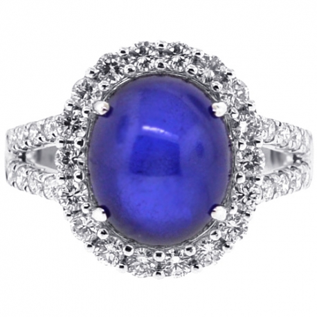 Adorn your finger with this gemstone cocktail ring of exquisite design! Professionally created from luxurious 18k white gold, it's polished for very smooth shiny look. The central stone features a diffused blue oval cabochon-cut real sapphire weighting 7.98 carats. There are also icy white round brilliant-cut natural diamonds of 1.10 carat around. The shank of the gemstone ring measures 2.5 mm in width, and the head is 16 x 14 mm. Our women's engagement halo ring will be a prized addition to any jewelry collection!